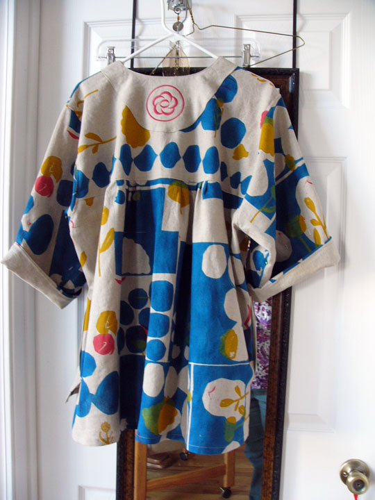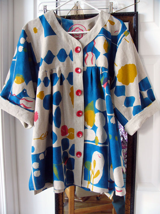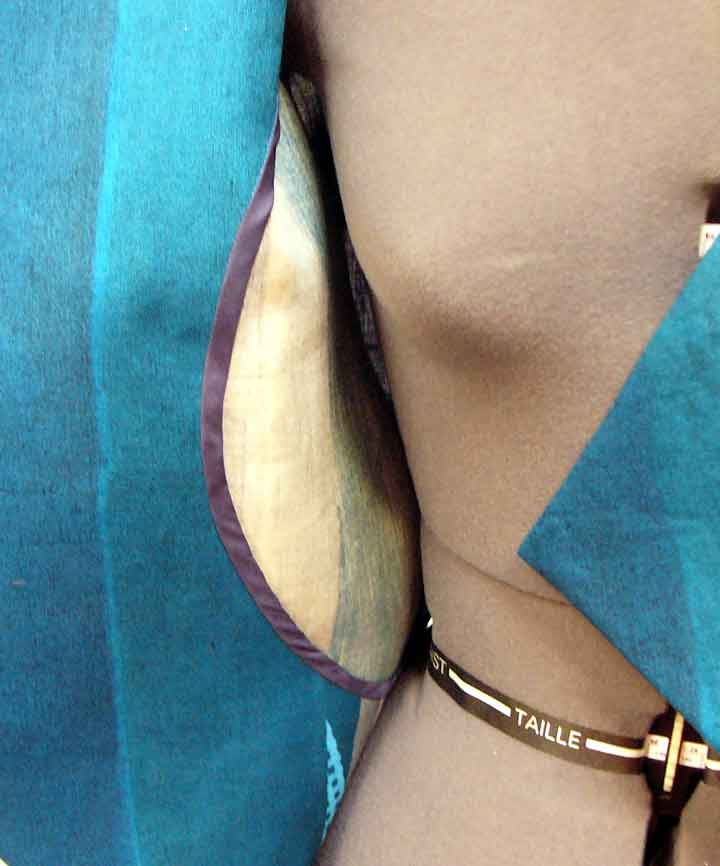 | | Finally a perfect dyed geode button from Websters in Ashland for the front. It has another button toggled behind it so the buttonholes can be 1/2 inch long and the button is inserted like a cuff link and remains stable in front. |