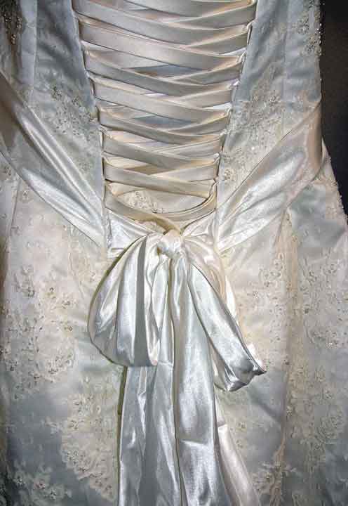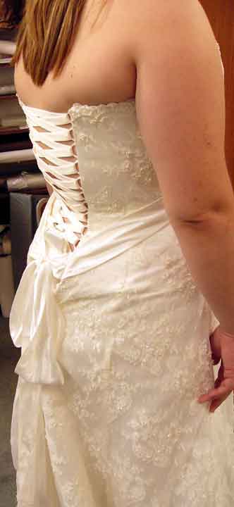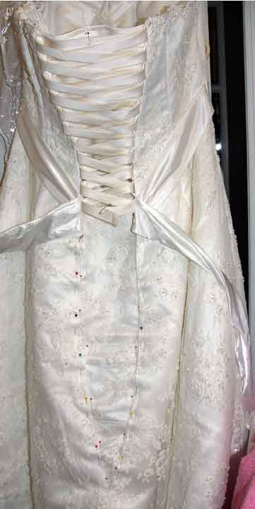 | | The latest bride who fell in love with her front view while needing another 8 inches across in the back. I removed half the zipper, made rows of corded loops and sewed the corset panels to each side. The safety pin marks the center of the lacing ribbon and anchors it to the satin modesty panel I made during the alterations. Once the dress is finished the new grosgrain ribbon will extend to the bottom (literally) and the bow will be hidden inside. |